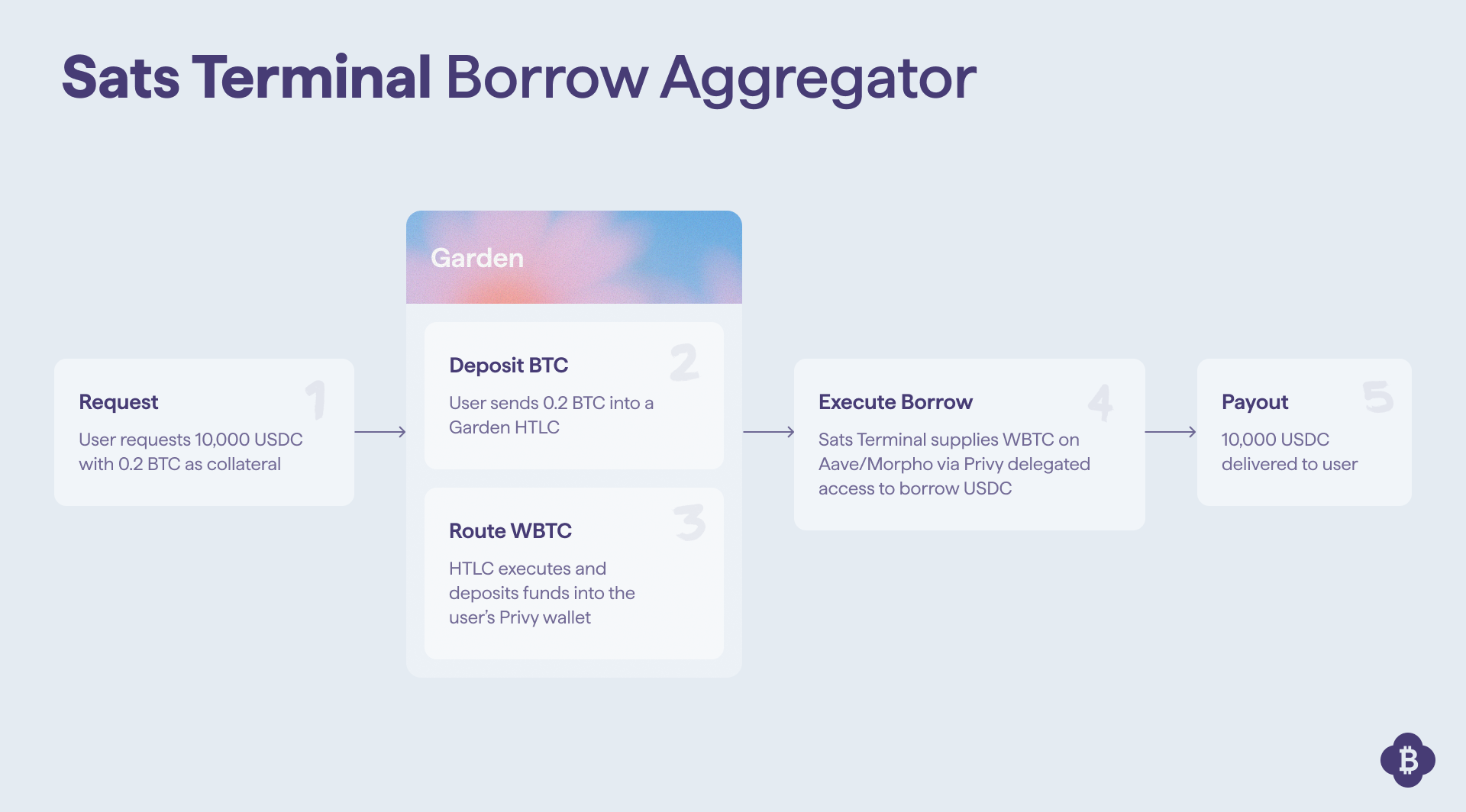 Sats Terminal integrated Garden via the API to power cross-chain Bitcoin execution for their borrowing aggregator. Their platform continues to handle loan aggregation, rate comparison, and user interface, while Garden executes the underlying Bitcoin movements non-custodially.
